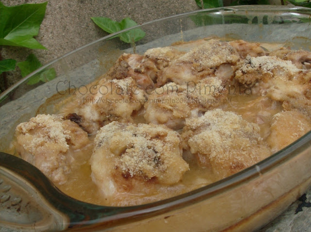 - Coloque o frango numa travessa de ir ao forno, previamente untada com azeite, espalhe a sopa de cebola por cima do frango, regue com o bechamel e polvilhe com pão ralado.