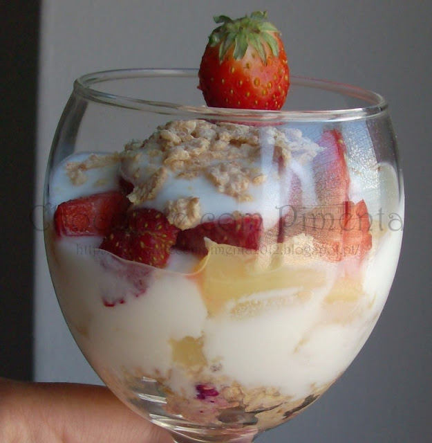 Bem, nem sabia bem o que lhe chamar... mas acho que pode ser servida como pequeno-almoço, lanche ou até mesmo sobremesa! Por acaso normalmente, costumo comer ao pequeno-almoço, agora com estes dias quentes sabe-me melhor do que comer apenas os cereais com leite. Também não houve lá muito tempo para tirar fotos, mas aqui fica uma: