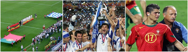 Há 12 anos atrás eu era apenas uma miúda de 17 anos que nunca tinha assistido a nada assim. Uma miúda que nunca tinha vibrado tanto por causa de uns "meros" jogos de futebol. Uma miúda que vibrou tanto mas tanto que até conseguiu convencer o pai a ir ver o jogo da final com ela ao ecrã gigante que estava na Praça do Giraldo. Até hoje nunca vi o Giraldo com tanta gente como naquele dia, e nem o facto do ecrã estar virado contra o sol fez com que se arredasse pé. Cantei e senti o Hino como nunca tinha sentido. Portugal estava a 90 minutos de ser Campeão da Europa. Fomos sempre superiores à Grécia, sempre!! Mas um golo de m*rda marcado através de um canto acabou-nos com o sonho. E ainda hoje, a memória que me vem à cabeça sempre que me lembro desse dia, é de ver o Cristiano Ronaldo a chorar compulsivamente após o jogo terminar. Não foi o único que chorou. Eu chorei. E vi pessoas a chorar à minha volta. Aquelas lágrimas do "puto maravilha" foram as de uma nação inteira...